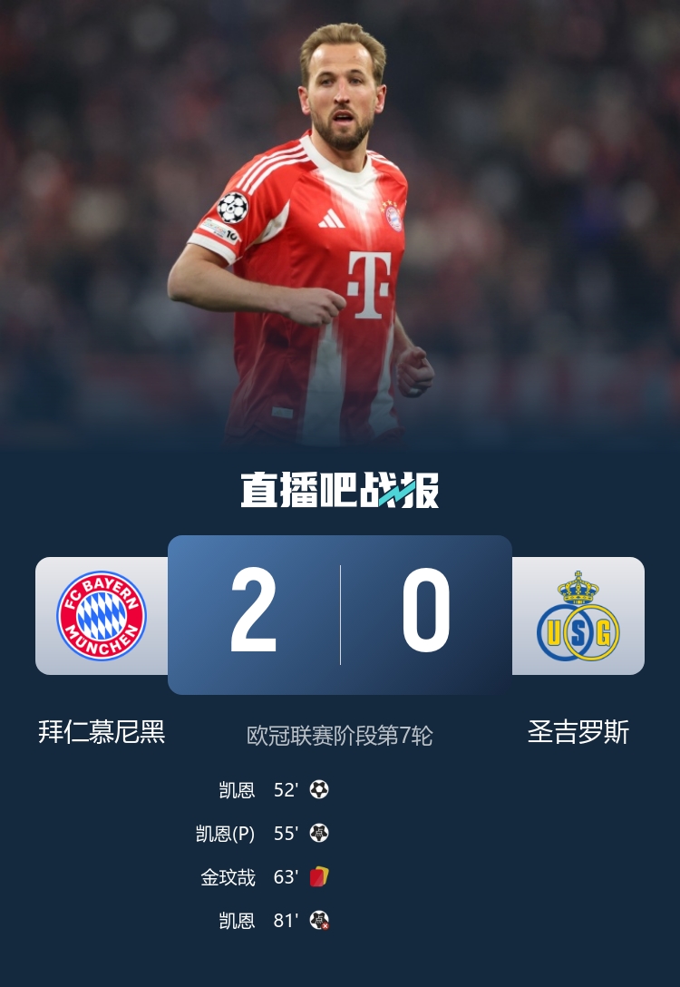 欧冠联赛阶段第7轮,拜仁2-0战胜圣吉罗斯,提前晋级,凯恩梅开二度+失点,金玟哉红牌。