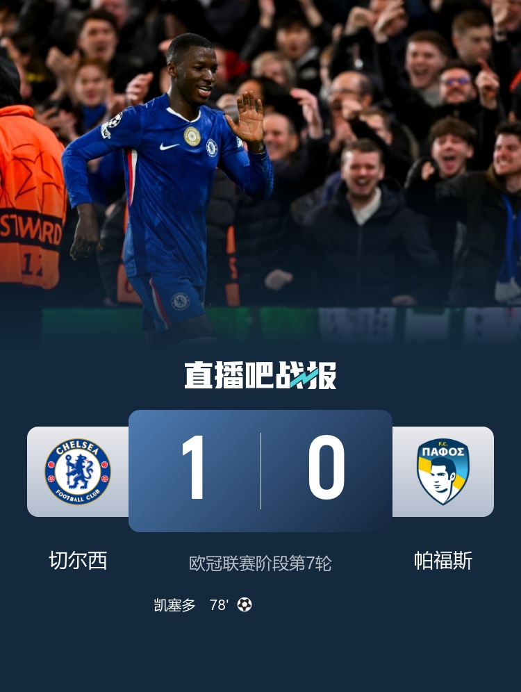 欧冠联赛阶段第7轮,切尔西1-0战胜帕福斯,凯塞多制胜。