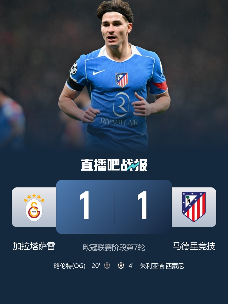 欧冠联赛阶段第7轮,马德里竞技客场1-1加拉塔萨雷,朱利亚诺·西蒙尼进球。