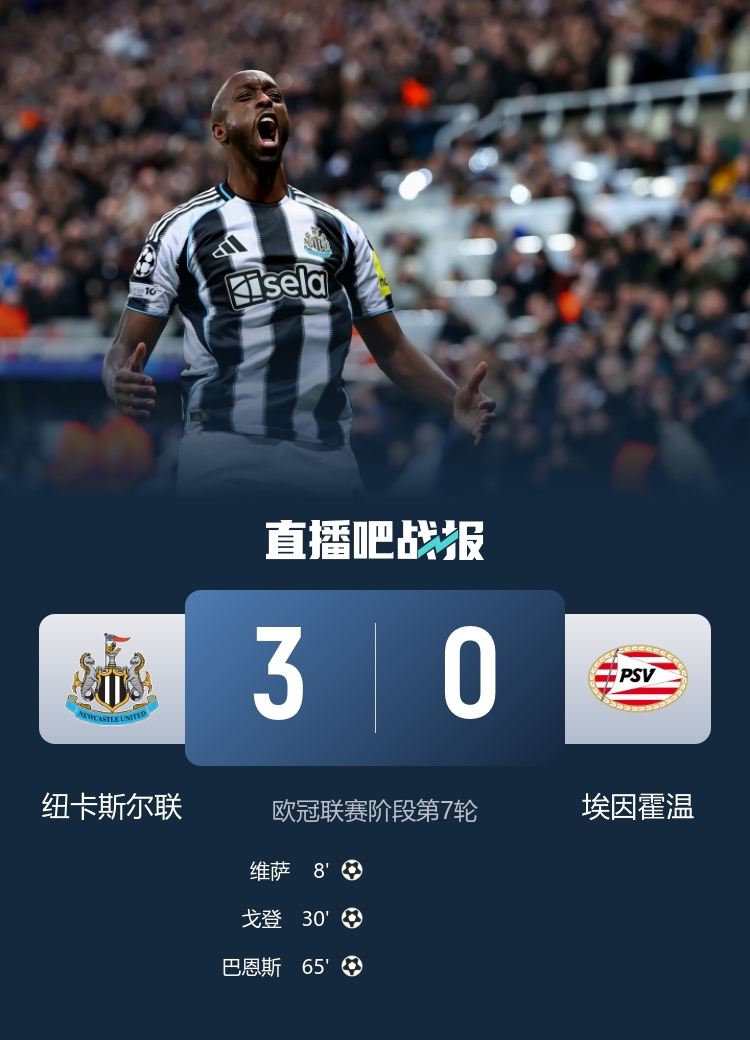 欧冠联赛阶段第7轮,纽卡斯尔联3-0轻松战胜埃因霍温,戈登进球。